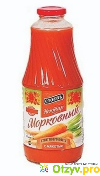 Сейчас я о Морковном с мякотью Стоев. Он в стеклянной прозрачной литровой бутылке, запаянной герметично сверху. Открывается поворотом и до хлопка разгерметизации. Никаких посторонних хлопцев через стекло не видно. По цвету как морковка на грядке, всем привычный цвет оранжевый. Сок то именуется, и в ценнике значился так за 80 руб (дороже бы я его не купила). На самом деле это всего лишь Нектар морковный с мякотью.