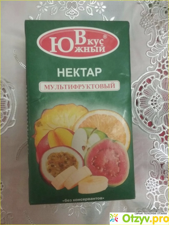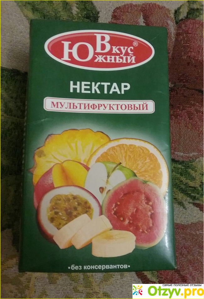 Находясь в одном из магазинов нашего города, я обратила внимание на литровую упаковку мультифруктового нектара, изготовленного из концентрированных соков и пюре любимых мною фруктов. Нектар был изготовлен из манго, апельсина, яблока, ананасов, маракуйи, гуавы и банана. На коробочке были изображены эти фрукты.