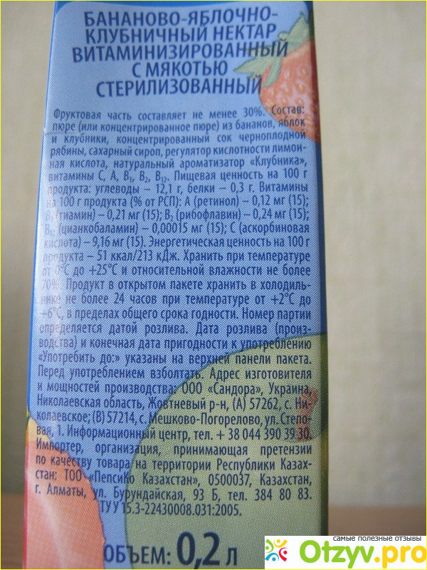 Все они также указаны на упаковке. Еще тут написано, что сока в упаковке 200 мл.
