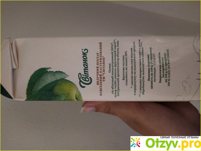 Я часто покупаю соки и нектары, их любит вся моя семья. Нам очень нравится яблочный нектар от торговой марки Свитанок. Этот нектар недорогой, но очень вкусный и с натуральным составом.