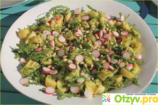 Отварной картофель нарезать крупными дольками , маленький редис нарезать тоненькими кружками и их должно быть очень много так как эта главная яркая нотка в салате , добавить кукурузу , и рукколу ( она очень часто в Италии в салатах используется ) . Посолить салат. И заправить либо растительным маслом либо оливковым маслом.