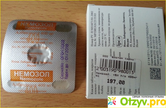 Препарат «Немозол» можно купить в форму суспензии (это более рекомендуют детям), а можно в форме таблеток. Так как моему мужу так принимать намного удобнее, то купил он себе в аптеке упаковку «Немозола», а которой содержится блистер всего с одной таблеткой (четыреста миллиграммов). Цена за упаковку составила почти сто пятьдесят рублей. Одна таблетка — это одноразовая доза препарата, которую мой муж принял, как и следовало из инструкции после еды, запив обильным количеством воды. Таблетка довольно большая по размеру и горькая, поэтому глотать ее было не очень приятно. Но это мелочи, в конце концов, мы имеем дело с лекарством, а не с конфеткой)).