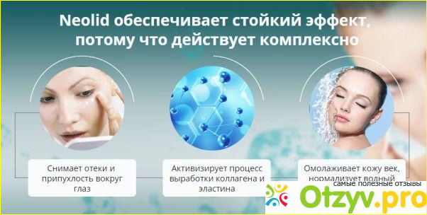 Благодаря Neolid к вам вернется уверенность в себе, вы будете знать, что выглядите великолепно. Клинические исследования препарата на базе института косметологии имени Тарасова, подтвердили то, что средство помогает избавиться от отеков под глазами в 99% случаев. Женщины высоко оценили действенность средства и 89% из них поставили препарату оценку отлично, не отметив никаких сложностей в использовании или негативных последствий.