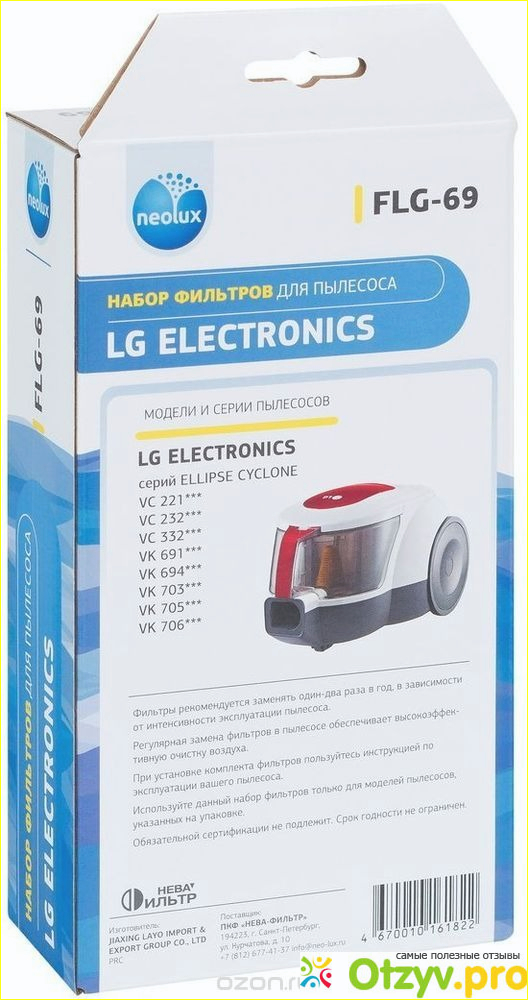 Вес фильтров Neolux FLG-69 сто пять граммов, они подходят к одиннадцати маркам пылесосов LG, производитель Китай.