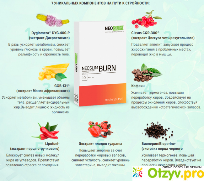 Описание Neo Slim Burn даже не соответствует своей действительности, так как написано очень много лишнего и неправдоподобного: активно сжигает липиды, увеличивает метаболизм, стабилизирует пищеварение, улучшает общее самочувствие, подавляет аппетит, устраняет отечность, предотвращает развитие серьезных патологий, останавливает процессы ожирения, убирает целлюлит, подтягивает кожу, улучшает состояние волос, кожи, ногтей, замедляет процессы преждевременного старения. И вообще, он умеет варить кофе и вышивать крестиком... Только так остается написать, так как чрезмерно обширный список возможностей для обыкновенного БАДа, вам так не кажется?
