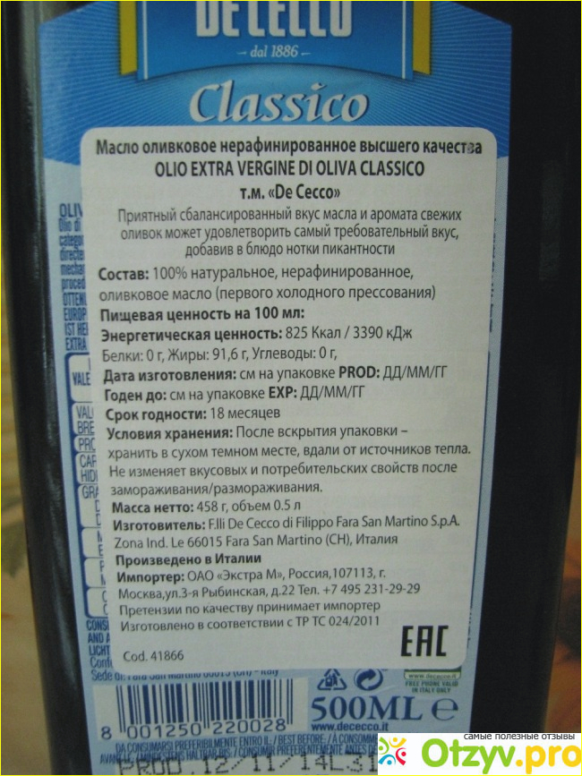 Калорийность у любого масла всегда высокая, но поскольку масло не рафинированное, оно содержит много витаминов. На упаковке не указана кислотность масла, если кислотность высокая, то в масле больше витаминов и микроэлементов, и оно полезнее. Используется такое масло в салаты и готовые блюда. Вкус мне понравился не очень, есть несколько неприятный привкус, как у дешевых испанских оливковых масел, продающихся по акциям в Молнии, у них чаще всего был плохой вкус. Испанское оливковое масло я давно перестала покупать, но в данном случае итальянское немного подвело. С оценкой производителя я не согласна. Если умеренно налить масла в салат и добавить бальзамический уксус, неприятный привкус не очень чувствуется, тем более, что продукт в любом случае очень полезный. Но из-за привкуса больше это масло покупать не буду.