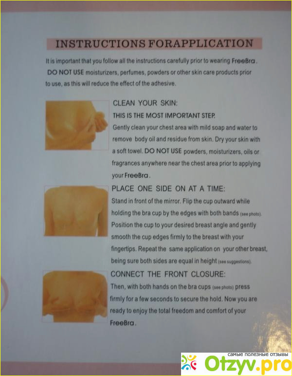Для того чтобы чашечки сидели на вас как вторая кожа, избегайте кремов и лосьонов, так как любая жирная поверхность уменьшит клейкие свойства Freebra. Для начала вымойте грудь с мылом и просушите кожу. Затем встаньте перед зеркалом и взяв одну из чашечек выверните ее, приложив нижний край изделия под грудь. Приподнимите грудь и расположите ее внутри чашечки ровно по центру. Движения должны быть плавными, тогда будет как вторая кожа. Потом разгладьте поверхность рукой поправьте лиф. Соедините обе чашечки застежкой и грудь мгновенно преобразиться. Снимать лиф нужно аккуратно, так как поверхность мягкая и тонкая не поцарапайте клеющую поверхность чашечки руками. После носки бюстик нужно промыть и просушить вывернув клейкой стороной наружу. Лучше всего использовать обычное мыло и мыть руками без губок и мочалок.