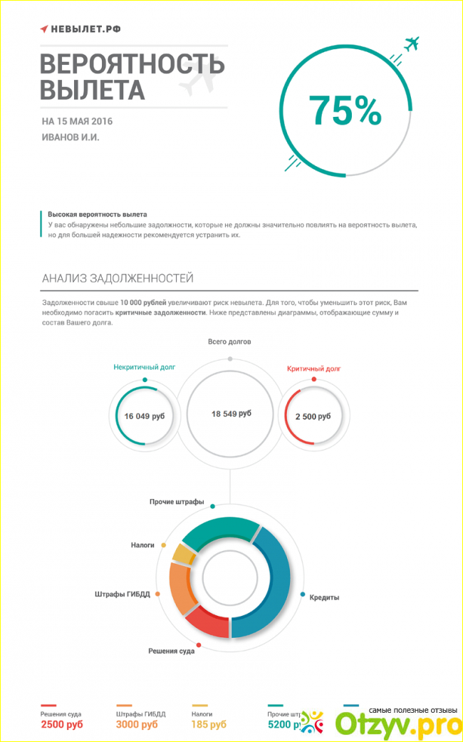Можно проверить задолженности по кредитам, из которых вас также могут не пропустить за границу. Данный сервис покажет вам причину, по которой вас могут задержать. Пользоваться этим сервисом очень легко. Вам необходимо зайти на указанный адрес сайта и заполнить поля: фамилия, имя, отчество, контактные данные, электронную почту. Затем нужно поставить галочку, которая подтверждает ваше согласие. Нужно нажать на кнопку- оплатить. Вам придёт счёт. Далее вы получите информацию вероятности вылета с пояснением. У вас могут быть обнаружены небольшие задолженности, которые не смогут повлиять на процесс. Но для большей вероятности необходимо устранить их. Будут указаны диаграммы, отображающие состав и сумму долга. Будет произведён полный анализ. Сервис помогает решить проблему и даёт рекомендации к действию, благодаря которой вы с высокой вероятностью сможете получить свой долгожданный отдых. Сервис имеет один недостаток. Нужно оплатить полную стоимость, чтобы воспользоваться услугой. Оплатить можно через интернет, банковской картой. В две тысяча восемнадцатом году около полтора миллиона человек попали в список должников. А в две тысяча шестнадцатом году в такую ситуацию попали девятьсот тысяч человек. В этом случае деньги за тур потеряете и не сможете вернуть, даже если тур застрахован.