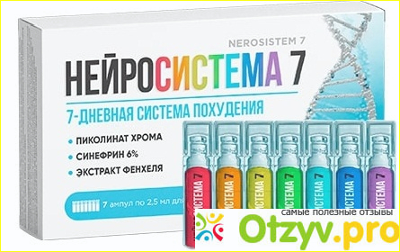 При помощи этого препарата можно легко и эффективно сбросить лишний вес. Обещаний тут дается очень много. В частности при помощи данного препарата ускоряются метаболические процессы в организме, происходит очистка организма, сжигается избыточный жир, устраняется тяга к употреблению вредной для организма еды, устраняются отечности, происходит снижение аппетита, также происходит блокировка дальнейшего отложения жировых запасов. Если верить тому, что написано на упаковке, то данная система рассчитана на семидневный срок, то есть на неделю. Это видно из самого названия препарата "нейросистема 7". Сама упаковка состоит из семи ампул, которые наполнены разноцветным содержимым. Каждый день предполагает употребление конкретной ампулы.