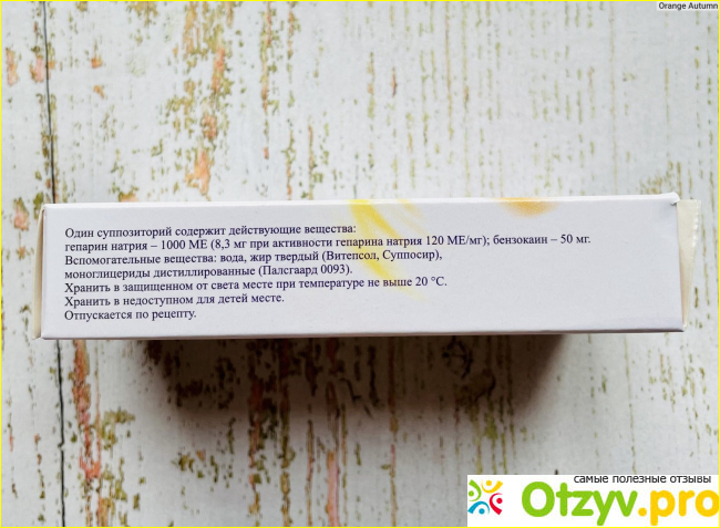 В составе препарата содержатся сразу же два активных компонента: гепарина натрия в дозировке по 1000 МЕ, бензокаина 50 мг. Выпускается в форме ректальных свечей, так как лекарство обладает комбинированными свойствами, то оказывает выраженный антитромботические и анестезирующий эффекты. Гепарин относится к антикоагулянтным веществам, поэтому помогает снизить склеивание (агрегацию) тромбоцитов и минимизирует риски развития тромбообразования, также ускоряет процессы фибринолиза, то есть ускоряет процессы растворения сгустков или уже имеющихся тромбов, помогает восстановить нарушенное кровообращение. Препарат препятствует развитию тромбообразования, ограничивает его развитие и устраняет повышенную ломкость капилляров, улучшает микроциркуляцию крови, регрессу геморроя, уменьшает отечность. Благодаря бензокаину лекарство обладает выраженными местно анестезирующими свойствами.