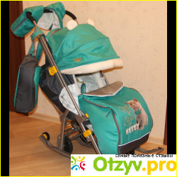 Две молнии по бокам чехла позволяют переобуть ребенка или поправить что-то, не снимая всего чехла. Полозья мощные, плоские, ширина 4 см. Колёса большие, прочные, покрыты резиной.