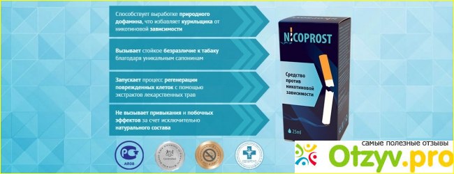 Состав Nicoprost не химический, натуральный. Не приводит к развитию другой – лекарственной - зависимости. Для жизни без сигарет не придется пить продукт постоянно. Достаточно пройти один полноценный курс. Для курильщиков с большим стажем, возможно два. За время терапии изменится восприятие и отношение к табаку.