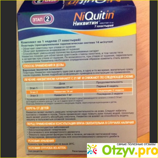 На упаковке крупно написано, что пластырь от курения Никвитин 21 мг — это 1 этап на пути отказа от нашей вредной привычки. Далее — 2 тап, тоже пластырь, только у него уже меньшая дозировка — 14 мг.