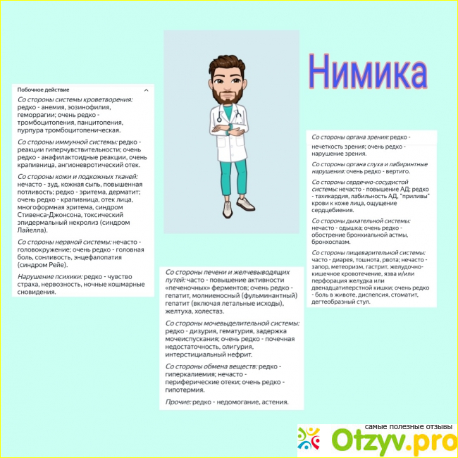 При приеме Нимики редко возникает побочка. Однако описаны жалобы некоторых пациентов на задержку жидкости в организме, тошноту, рвоту, боль в желудке, диарею, головокружение, сонливость, кожные высыпания, зуд. Известны случаи анафилактического шока, лейкопении, анемии других серьезных нарушений в работе организма, связанных с применением Нимики.