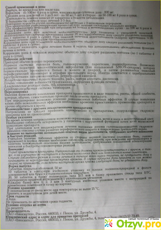 Особенность этого препарата в том, что он не метаболизируется, не разрушается в печени и в неизменном виде в высоких концентрациях накапливается в моче, где убивает не только микробы но и грибки. Нитроксолин - отечественный препарат, производящийся из отечественного сырья, что определяет его доступность и невысокую цену: упаковка из 50 таблеток стоит в аптеках от 40 до 70 рублей. Картонная упаковка, внутри пузырёк с 50 двояковыпуклыми таблетками.