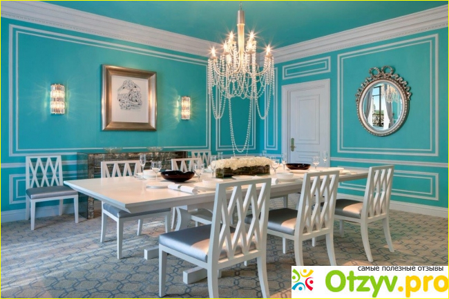 В Нью-Йорке молодожены могут поселиться в дизайнерской опочивальне в стиле Тиффани, конфеты, стены, столовая, тарелки, кровать, сахарницы. Много в красивом ярко-голубом, одноимённом запатентованном цвете.