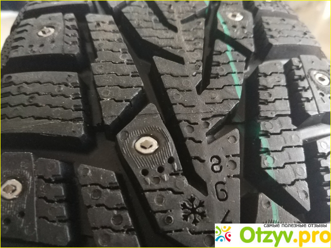 Если посмотреть на металлические шипы, то можно обратить внимание, что они имеют интересную форму в виде овала с ромбиком на вершине и у них мягкая посадка. Но это хорошо в снег и гололед, но если на улице плюсовая температура, то эксплуатация данных шин грозит быстрому их износу, особенно это качается передних шин. Рекомендую в такую теплую погоду ездить на них аккуратно, не допуская пробуксовки, и тогда они вам послужат долгое время.