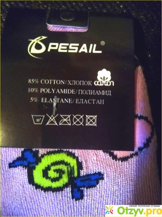 ТМ «Pesail» мне неизвестная. Носки имеют ряд обозначений по уходу за ними (стирка, глажка) и указано, что хлопка они содержат 85%, что очень даже хорошо. Оставшиеся 15% тканей – синтетика. Из них всего 5% эластан, обычно лайкра, это сегментированный полиуретан похожий на резину. По всей видимости это и есть резинка в носочке, позволяющая ему удерживаться на ноге.