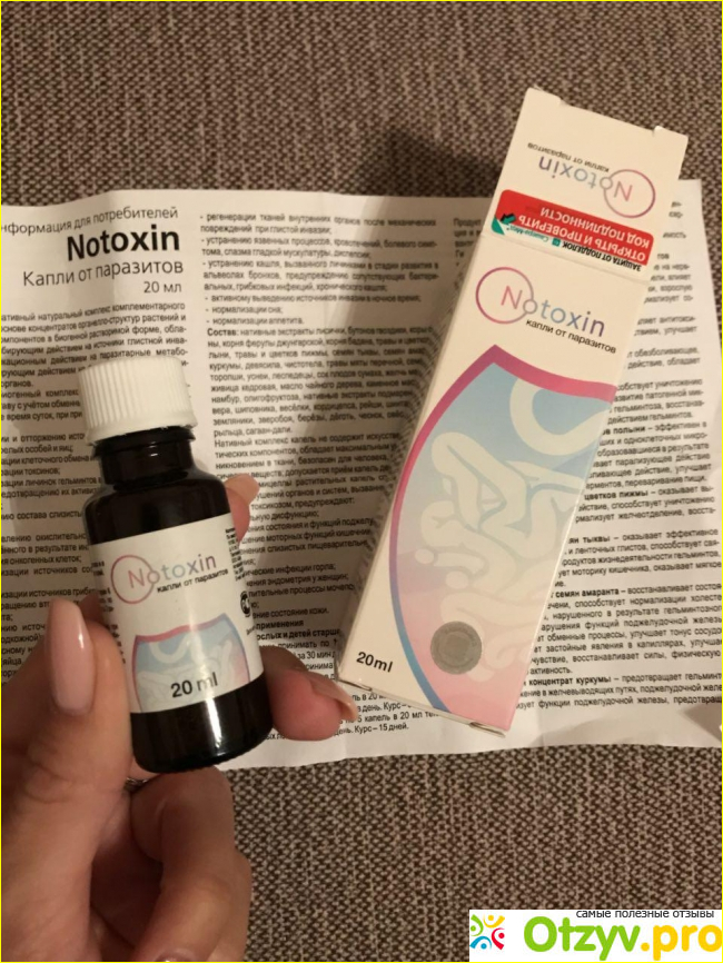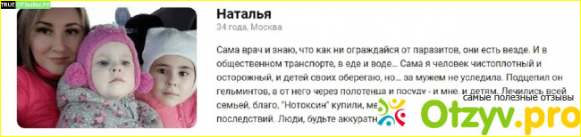 Итак, за двадцать дней мы избавились от паразитов. Прошли частые боли в животе, проблемы со сном (у сыночка) и аппетитом. Без следов на коже или других побочек. Сейчас анализы очень радуют. Я могу сделать вывод о несомненной эффективности «Нотоксина»!)).
