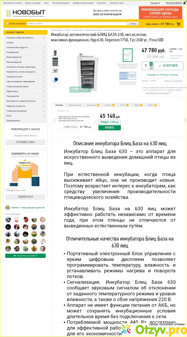 Новобыт, может похвастаться неплохим интерфейсом и достаточно информативным наполнением в части описания товаров. Есть строка поиска и подробный перечень позиций с подпунктами. На первый взгляд может показаться, что выбор товаров огромен, однако при заказе конкретной позииции может выясниться, что товара нет в наличии. Когда мы выбрали конкретную модель инкубатора, оказалось, что её нет в наличии, пришлось искать другой товар.
