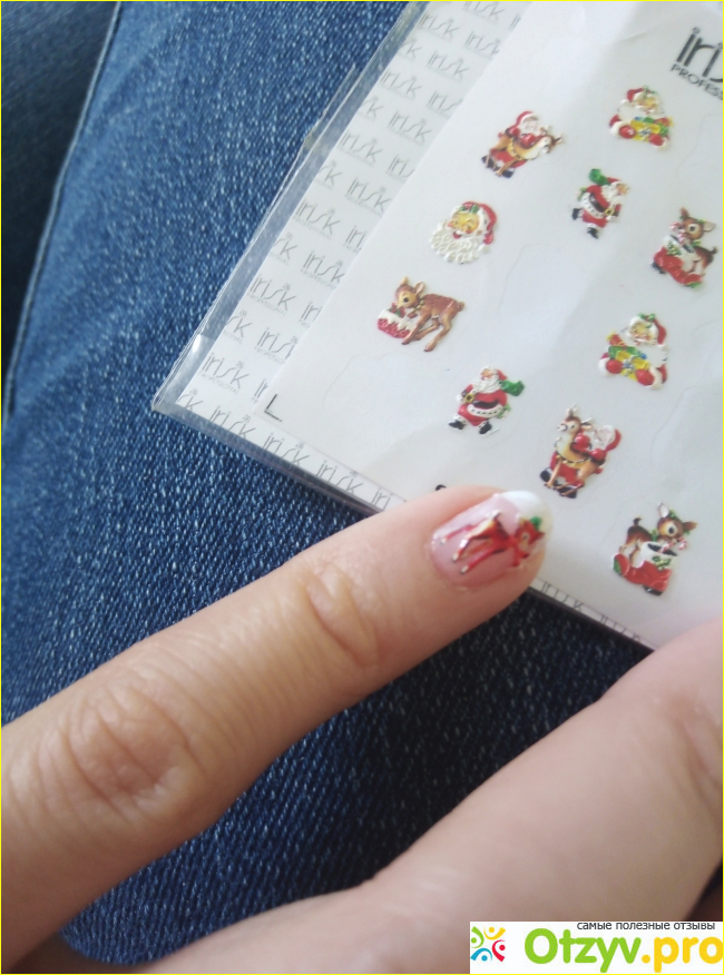 Я купила в магазине гель лаки и новогодние наклейки для ногтей. С сантаклаусами и оленями. Очень интересная тема новогоднего маникюра. Стоимость наклеек 70 рублей, хватит на много раз.