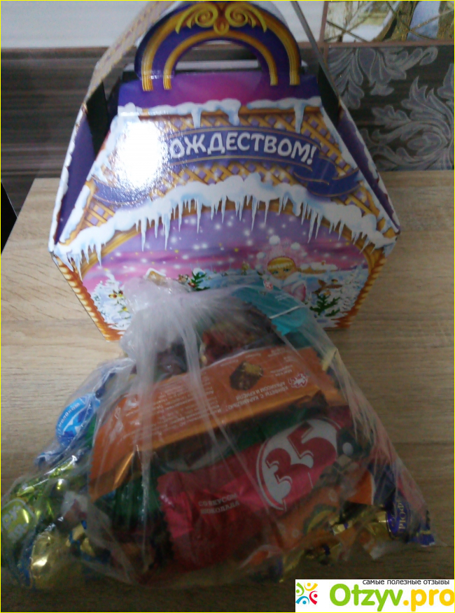 Теперь немного о самом подарке. Считаю его очень достойным и честным для ребенка. Называется новогодний сладкий подарок с надписью с новым годом и рождеством "шкатулка".