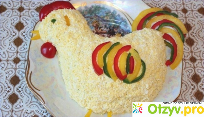 На блюдо все ингредиенты высаживать слоями , сформировав предварительно форму петуха.