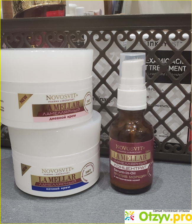 В поисковике аптеки на запрос «ламеллярная эмульсия» выдало данный продукт: Novosvit La Mellar дневной, ночной крем и сыворотка-концентрат. Меня смутила цена, уж очень она была невысокая для крема и сыворотки, каждая позиция чуть больше 300 руб. Я решила попробовать, купила и дневной крем, и ночной крем и сыворотку-концентрат.