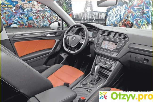 Салон тигуана этой модели выглядит очень прилично, благодаря кожаной отделке, алюминиевым вставкам и контрасту цветов. Когда вы нажмете кнопку старт, неожиданно ощутите премиальность этой модели тигуана. Она раскроет перед вами возможности нового большого цифрового, компьютеризированного щитка приборов. Как в новейших молях мерседеса или вольво. Кроме этого имеется проэкция на лобовое стекло и большая мультимедийная система с навигацией и другими различными функциями. Эти новшества дают ощущения того, что вы находитесь в инновационном автомобиле. Тигуан имеет очень много встроенных систем, которые требуют аналоговых приборов, благодаря чему и появился такой красивый и модифицированный щиток. Который работает, выглядит и устроен по принципу планшета или смартфона. Ещё один важный момент в устройстве тигуана второго поколения это камера с обзором на 360 градусов. С её помощью вы сможете проехать, не повредив машину, и в самых узких местах. Самая впечатляющая функция камеры, это возможность вращать обзор автомобиля на 360 градусов, что даёт возможность осматривать пространство вокруг машины. На двери имеется специальная накладка, которая полностью закрывает порог от грязи. Благодаря чему, выходя из машины вы не испачкаете свою одежду, задевая порог. Для задних сидений, которые при желании можно сложить, в салоне отведено значительно больше места.