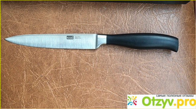 Нож состоит из лезвия, которое изготовлено из нержавеющей довольно толстой стали 3Cr13. На лезвии присутствует штампик бренда, само лезвие на состояние "из коробки" очень острое. Другой вопрос - как долго оно протянет в этом состоянии. Ведь именно это и характеризует качество ножа. Но на данный момент острота ножа сохраняется, хотя используем мы его повсеместно.