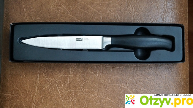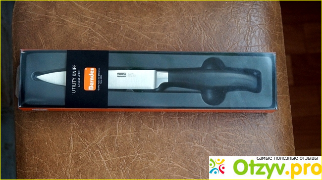 Нож Berndes универсальный продается в очень солидной упаковке, которая вместе с ножом выглядит довольно добротно и богато. Лицевая сторона упаковки прозрачная и через нее виден сам нож. Сам нож размещен в упаковке черного цвета, которая, стоит отметить, сделана очень добротно и притягивает взгляд. Сам нож безопасно размещен в пластмассовой нише с специальными язычками, которые защищают внешний мир от довольно острого лезвия.