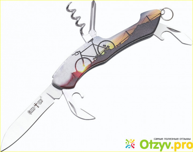 Нож достаточно компактный и функциональный. Помимо непосредственно лезвия ножа, он имеет возможность выполнять функцию открывашки для бутылок, штопора, открывашки для консервных банок и крестообразной отвертки, в общем всего того, что может пригодится в путешествии. На рукояти ножа к тому же есть небольшое колечко, за которое можно нож прицепить на пояс, на крючок, гвоздик или еще куда нибудь.