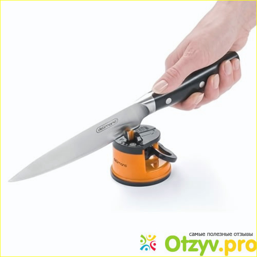 Для начала работы достаточно закрепить прибор на столе. Одной рукой мы прижимает его присосками. Для заточки любого из ножей достаточно плавно провести лезвием по желобку точилки. Повторите процедуру четыре раза. После этого вы на несколько недель забудете об этом и сможете наслаждаться качественными ножами.