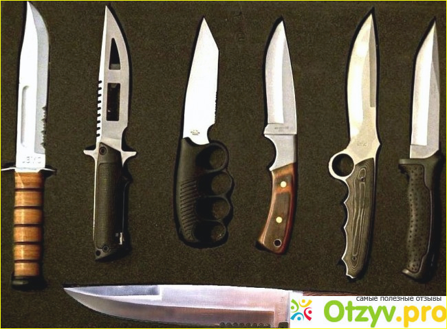 Охотничьи ножи. Длина и толщина сильно варьируются. Сталь твердость не ниже 56 единиц по роквеллу.