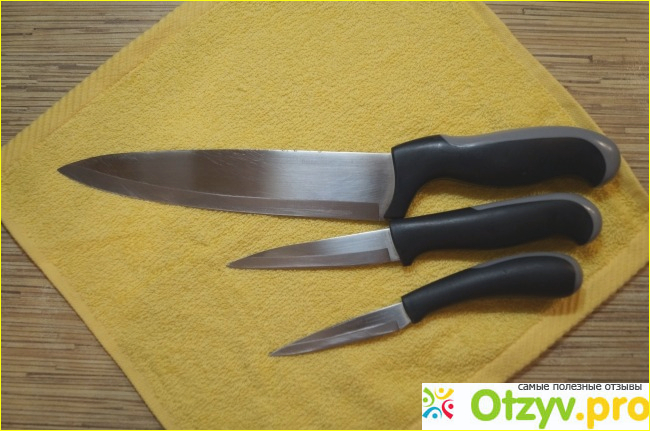 Для столь хороших, но привередливых, как оказалось, ножей пришлось приобретать специальную точилку-мышку от Tupperware. Результат порадовал сразу. После непродолжительных манипуляций (сначала затачивание, потом полировка), острота у лезвий получается такая, как говорится "только от одного взгляда порезаться можно". Так как затачивание ножей входит в неписанные обязанности мужа ("какой нож, такой и хозяин!"), я прошу его не делать их слишком острыми, иначе непременно травмируюсь.