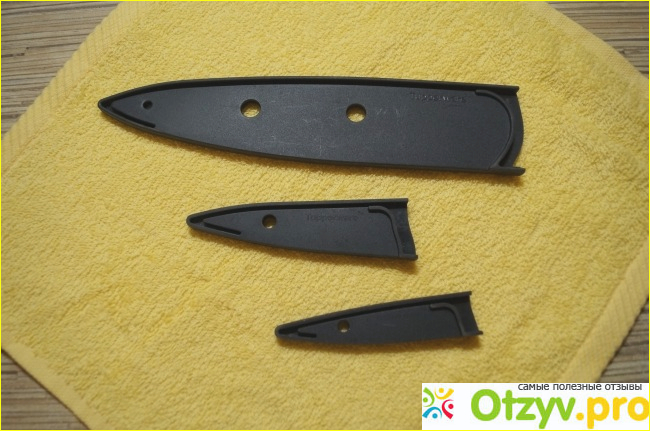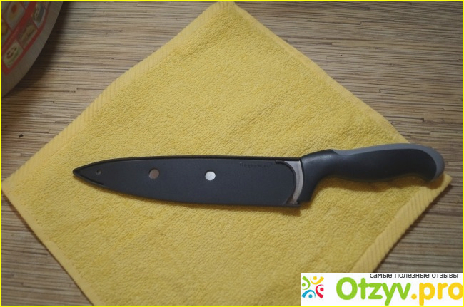 Конечно, с учетом ежедневной готовки постоянно ножи в чехле держать не будешь, для них есть специальная подставка (тоже, кстати, Tupperware). Но вот в случае перемещения ножей... к примеру, на дачу, на шашлычки собрались - как без ножа? Завернуть в десять бумажек и в пакетик? Согласитесь, защитный чехол выглядит гораздо более цивилизованно, к тому же необходим как для защиты от порезов, так и для защиты самого лезвия.