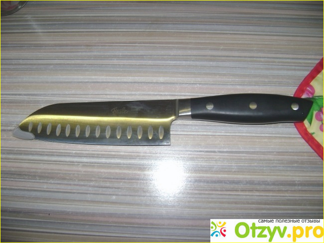 Лезвие его изготовлено из высококачественной нержавейки, гармонично переходящей в рукоятку, которая дополнительно для удобства в руке дополнена пластиком. Нож исключительно острый, довольно удобно лежит в ладони. Удобнее всего с ножом работать на нарезке небольших кусков мяса, овощей, удобно нарезать лапшу и салаты. Несмотря на относительно небольшие размеры, нож с легкостью перерубает кости. На разделку подмороженной тушки курицы ушло секунд 30-40, я реально ее нарезал! Также удобно чистить и овощи. После покупки нож еще ни разу не затачивался, несмотря на все мои эксперименты, лезвие очень хорошо держит заточку.