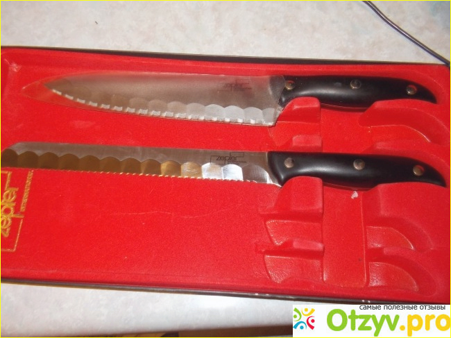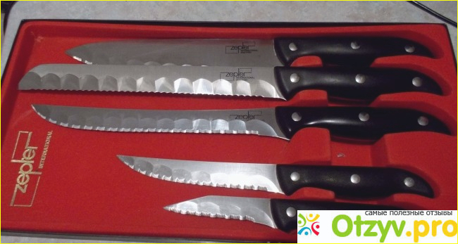 И я написала, что отдельно расскажу о ножах. Но купили то мы их вместе с кастрюлями типа по какой - то акции. Еще и догрузка была в виде терки (правда, другой фирмы - vaksi). Терка плохо трет, а вернее вообще не трет. И она просто валяется. Отношение к ножам, честно скажу, при покупке было не очень. Причина - дорого стоили да и терка .... Так вот с ними получилось все наоборот, и я хочу поделиться своими впечатлениями о ножах фирмы Zepter. Это я сейчас так о них говорю хорошо, а вначале все было не так. И я думала, что за такую - то цену я их готова менять ножи хоть каждые полгода. Думала, просто красивая упаковка и реклама. В упаковке (черная коробка внутри выложена красной бархатистой тканью) их пять. К счастью, если так можно о ножах, они оказались супер- класс! Им уже более 10 лет. И мы их ни разу не точили. Они с лазерной заточкой. Режут хорошо, каждый со своей особой миссией. Для хлебо-булочных, для сыров, и так далее. Соответственно, и лезвия выполнены по-разному. Мы особо не разбирали, какой для чего предназначен. Просто стали пользоваться. Практика показала сама, какой для чего предназначен. Неудобство состояло в том, что три ножа очень длинные, и мы два из них временно отложили. Пользовались всегда, то есть ежедневно только двумя - средним и маленьким. Оба хороши. Ну и один из длинных ножей у нас используется один год для хлеба. Эти ножи режут, даже не приминая продукт. Хорошо резать помидоры, апельсины и другие продукты, которые приминая, выпускаешь сок. Качеств ножи до сих пор не потеряли. Единственное, о чем хочу предостеречь - быть осторожными. Режут все хорошо! Я столько раз травмировалась. И еще: лезвие одного ножа я все-таки замяла. Вот этот нож чуть хуже стал резать. Его подправили и опять нормально. Но все-таки он отличается площадью оставшегося лезвия с зазубринками. Прошло десять лет, мы пользуемся тремя ножами и у меня еще два длинных ножа совсем новых. Я не могу ничего сказать о ножах, которые сейчас выпускает эта фирма. Нашим ножам более десятка лет, и с ними ничего не произошло. И поэтому даже терку простили.... Современные ножи в другом дизайне, ручка другая - черно-красная. У нас ножи с черной ручкой. И мне это больше нравится. А в целом, если смотреть по лезвию, почти такие же. Так что, если встанет вопрос о покупке ножей, то zepter в хозяйстве супер!
