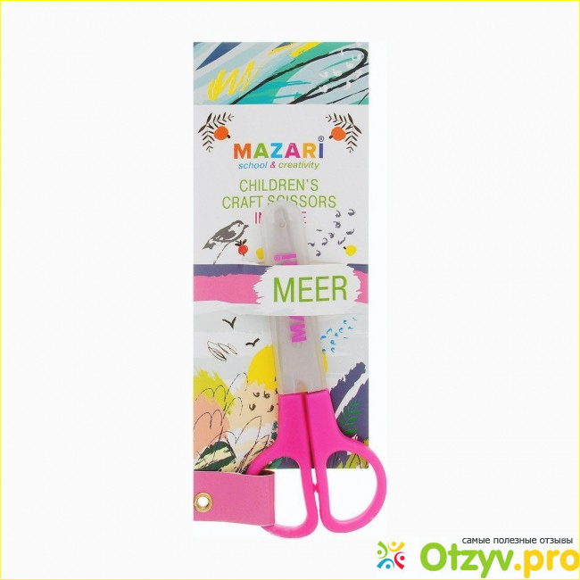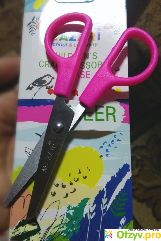 Ножницы изначально рассчитаны на привлечение детского внимания. Упаковка очень цветная и красивая. Мне понравился пейзаж, имитированный под масляные краски и птичка на ягодке. Вообще, картинка интересная. Из всех ножниц выбрали, конечно же, розовые. Но футляр у них белый, полупрозрачный. Проверить на месте, конечно, я не могла. Оставалось только верить. Что они качественные.