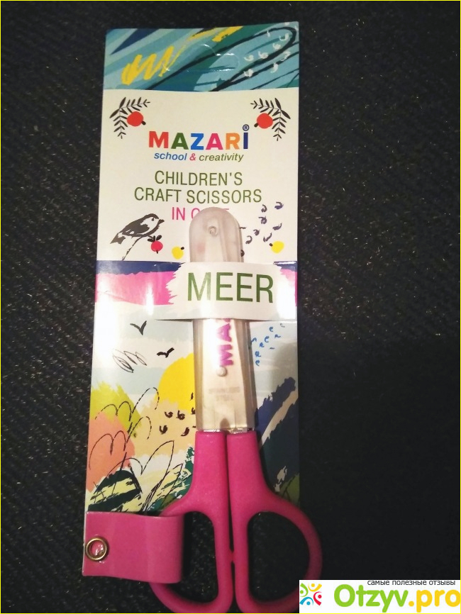 В школу она забрала ножницы, купленные ранее в аптеке, специальные для детского маникюра, тоже с закруглёнными кончиками. Но упаковки от них, к сожалению, не сохранилось. Вот это действительно хорошие ножницы оказались, хотя и покупались до войны за гривны ещё. И сталь, вроде бы тоже нержавеющая, а выгладит и ощущается в руках иначе. Этой торговой марки, Mazari, мы купили много вещей. Дело в том, что покупали с лотка на школьной ярмарке. И других фирм там почти не было.