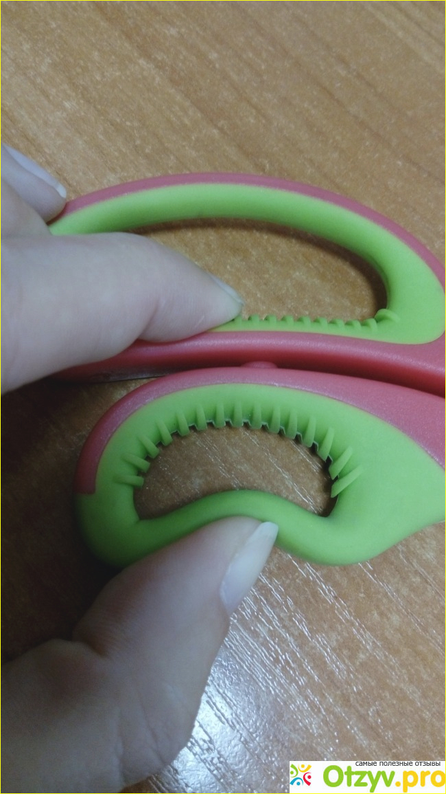 Эти ножнички мне понравились прежде всего своим дизайном. Они яркие, интересно скомбинированы ярко салатовый и красный цвет. Ручка не просто прорезиненная, а салатовая часть полностью резиновая, благодаря этому ножницы удобно лежат в руке и ими удобно решать даже плотный картон, пальцы они не надавливают.