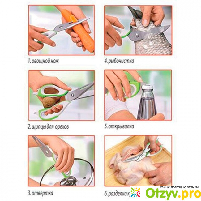 Ножницы можно использовать для отрезания плавников у рыбы и для разрезания пакетов и разных упаковок. Также ножницы могут служить открывалкой для бутылок. Я пробовала их в этой роли однажды, справляются вполне неплохо.