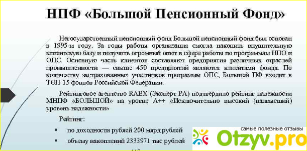 В общем, Большой пенсионный фонд – заслуживает доверия, учитывая, что существует он достаточно давно и до сих пор не развалился и не опозорился, думаю, можно перевести свои средства в эту организацию. Я давно уже являюсь клиентов пенсионного фонда Сбербанка, но всерьёз начала задумываться о том, что бы перевести свои накопления в другой негосударственный пенсионный фонд.