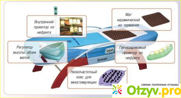 Основным лечебным эффектом кровати является семироловый внутренний проектор, состоящий из роликов из турмания. Он движется вдоль позвоночного столба, прогревая и растягивая диски между позвонками. Тепловая панель на малом мате содержит большое количество турманиевых дисков, что улучшает кровообращение и прогревает тело. Также в области поясницы есть низкочастотная подушка для глубинного массажа и прогрева.