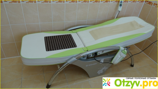 Чисто внешне это массажная кровать выглядит довольно непрезентабельно. Она чем-то напоминает обыкновенный топчан, на котором у манипуляционном кабинете делают в попу уколы. Он состоит из двух матов, один из них является основным, а второй дополнительный. Также есть специализированное устройство, чтобы произвести регулировку угла подъема. Заметила, что у этого топчана имеется специализированное покрытие, куда добавлены особые тонкие серебряные нитки. Благодаря им покрытие хорошо поглощает влагу, которую выделяет тело в процессе занятий, а также характеризуется бактерицидным эффектом, что в общем свойственно для серебра. Во внутренностях этого топчана располагается специальные, как мне сказали роллы турмания, они в количестве 7 штук. 6 из них имеют назначение массажировать спину, а 7 предназначен для массирования шеи, точнее шейных отделов позвоночного столба. В результате работы этого устройства происходит расслабление мускулатуры спины, освобождение сдавленных нервных окончаний, а если диски были смещены, то производится возврат их вместо локализации. Разумеется перед проведением такой сложной процедуры следует обязательно проконсультироваться со специалистом, чтобы не «насмещать» куда не нужно.