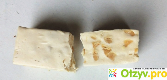 Нуга сладкая, мягкая, немного тяжеловатая при надкусывании, что-то на подобие резины, но к зубам не пристаёт и быстро жуётся, можно сказать быстро таит во рту.