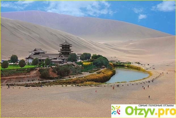 Это озерцо полумесяца является воистину удивительным, неповторимым, и изумительно красивым творением природы. Вода в этом озере отличается кристальной чистотой и прозрачностью, что придает ему еще большую загадочность. Здесь мы можем лицезреть сочетание несочетаемого. Когда путешественник впервые видит безбрежные пески гобийской пустыни и это небольшое озерцо, которое окружила зелень и прилегающие жилые дома, выстроенные в китайскомстиле, то это может скорее показаться неким миражом, чем реальностью.