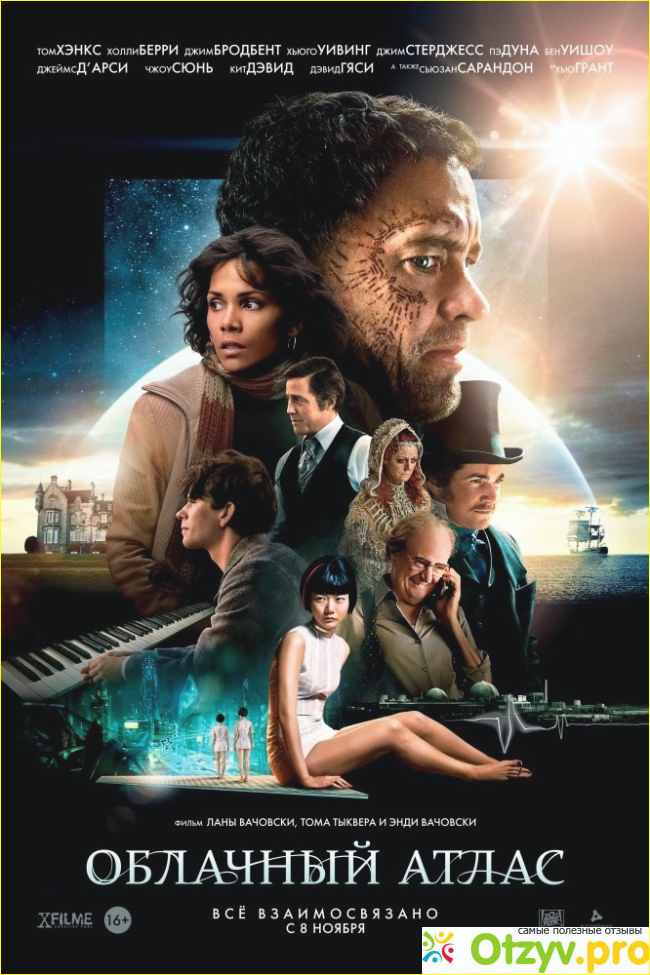 Хоть он и длится 2 часа 45 минут, смотрится на одном дыхании. В фильме несколько историй, которые происходят в разных веках при расцвете и упадке цивилизации на Земле, но взаимосвязанные между собой. Большая фишка экранизации, что разных героев в этих историях играют одни и те же актёры, но загримированные так, что только в конце фильма, в титрах, когда показывают кто кого играл, понимаешь, что данный актер играл, например, не 2, а 5 ролей. Но самое главное- это сюжет, который, как я считаю, очень актуален наше (и не только) время.. Очень советую посмотреть!