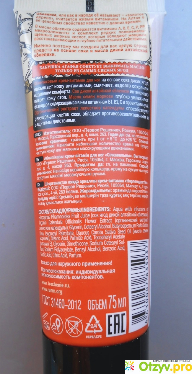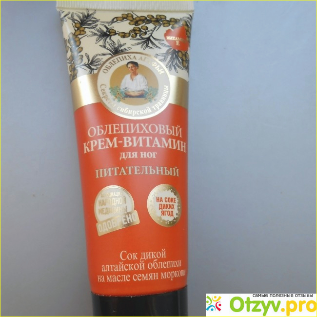 Замечательный крем, скажу я вам! Он так интенсивно питает кожу ступней, в том числе пяточки, что уже через несколько дней применения ножки выглядят очень ухоженными, будто после салонных процедур. Это совсем не удивительно, потому что это не просто крем, а питательный крем-витамин, в составе которого не только сок облепихи, но и масло семян моркови, богатое витаминами В1, В2, аскорбиновой кислотой и провитамином А, а также органический экстракт лепестков календулы.