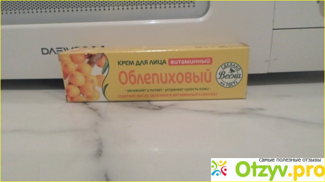 Расфасован "Облепиховый" витаминный крем для лица в приятный пластиковый тюбик объёмом 40 мл. Упакован в картонную красивую коробку. Очень удобный экономичный дозатор распределитель выдающий маленькими дозами. Великолепный косметический препарат обладает защитными и восстанавливающими свойствами который улучшает защищает и предупреждает преждевременное старение. А необходимые и полезные витамины при питании не вызывают жирного блеска на коже лица. Я очень люблю этот крем и у меня теперь постоянно имеется такой не дорогой и качественный косметический продукт. Не большая упаковка отлично помещается в сумочке всегда рядом всегда со мной. Изготовитель: ОАО Парфюмерно-косметическая компания "Весна", Россия, г. Самара.